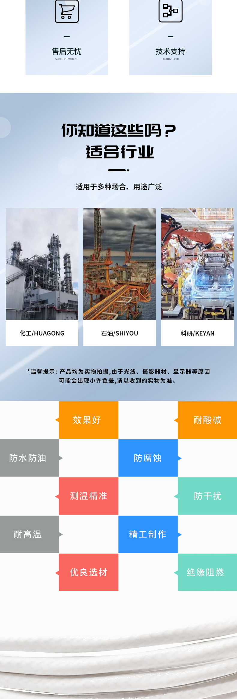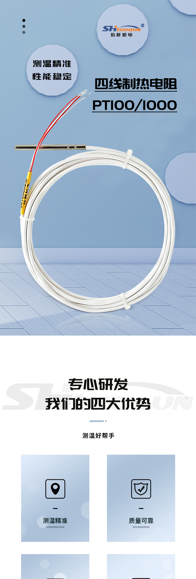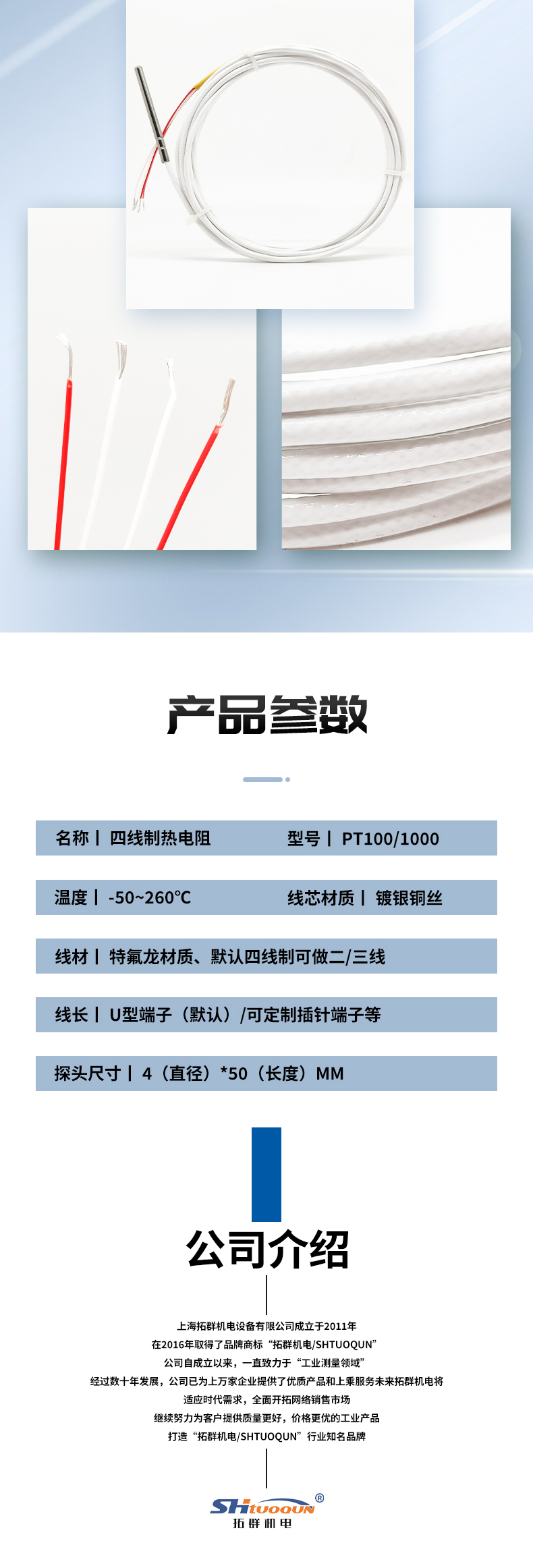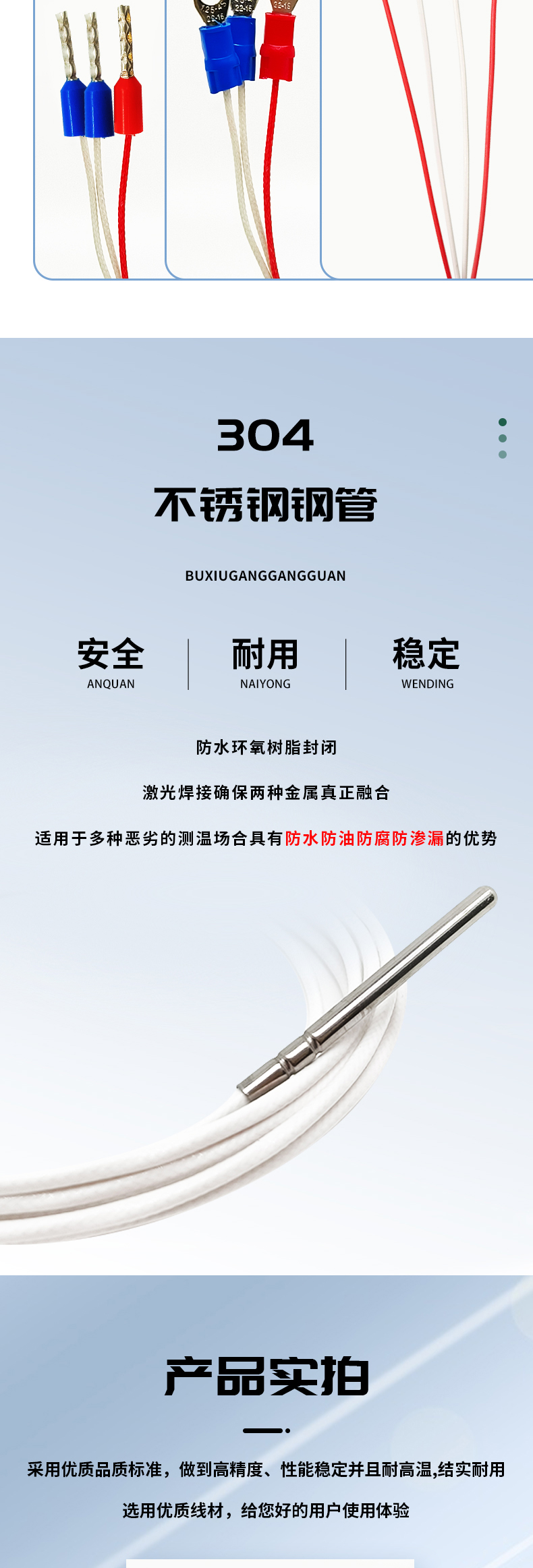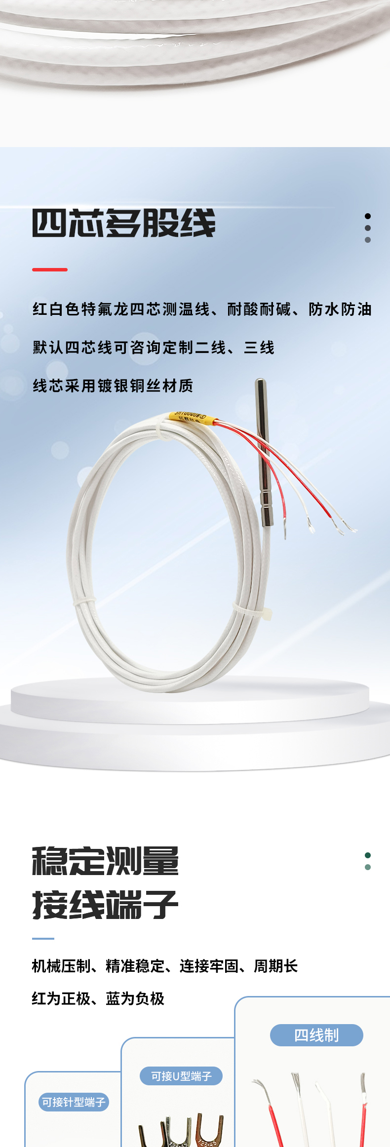 探头采用不锈钢材质防水防油防渗漏、线材采用红白色特氟龙四芯测温线耐酸碱可定制多规格
