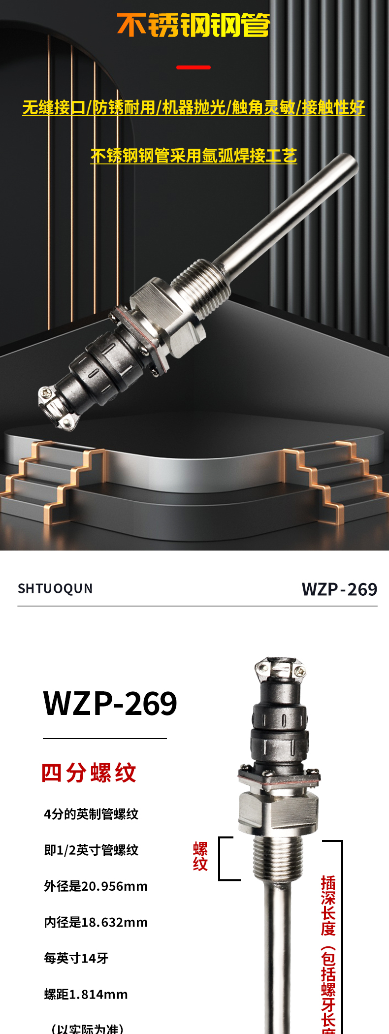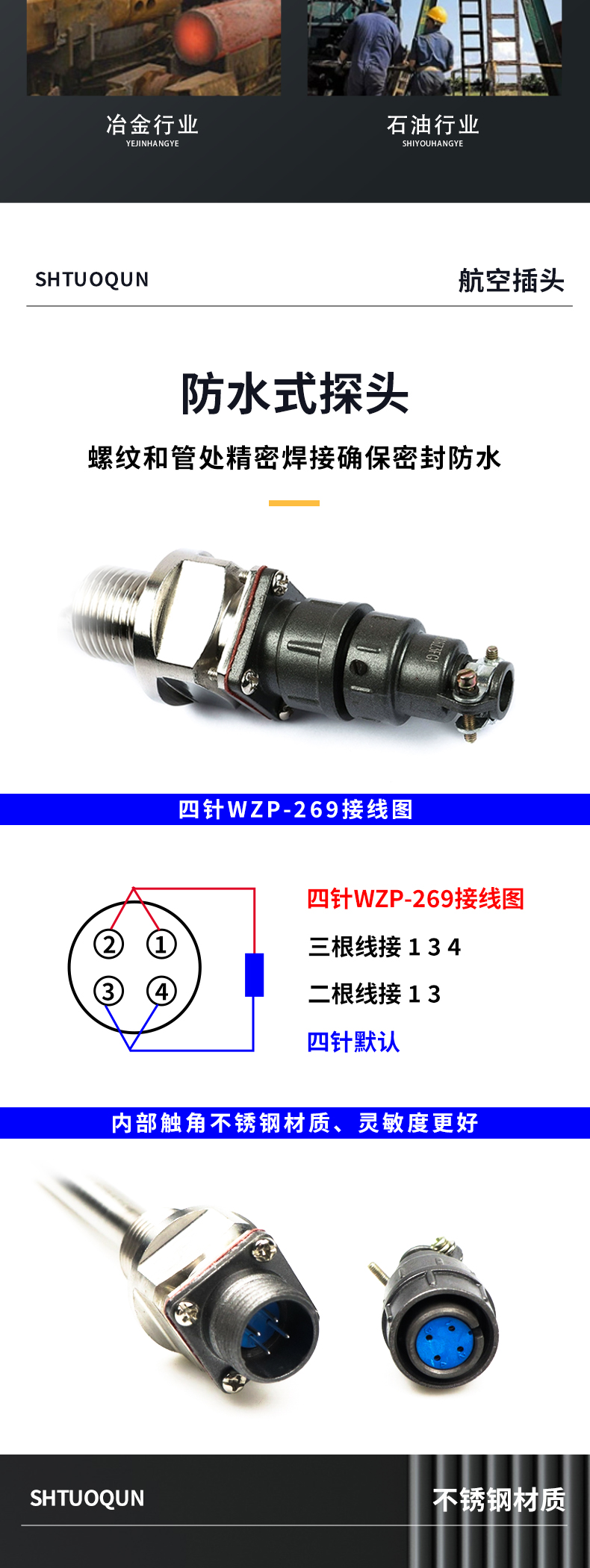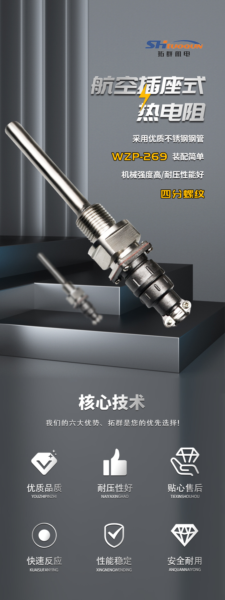 WZP-269航空插头式PT100热电阻四分螺纹温度传感器测温插头热电偶