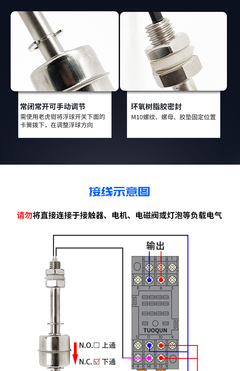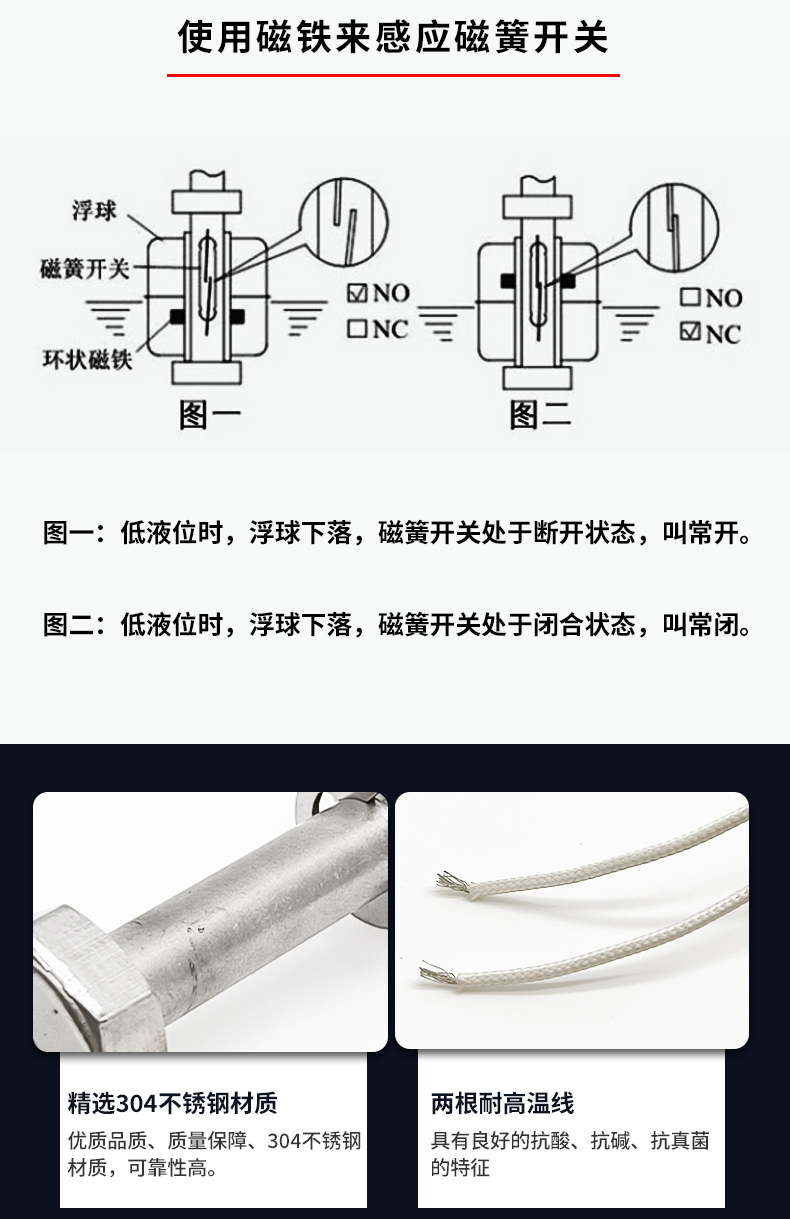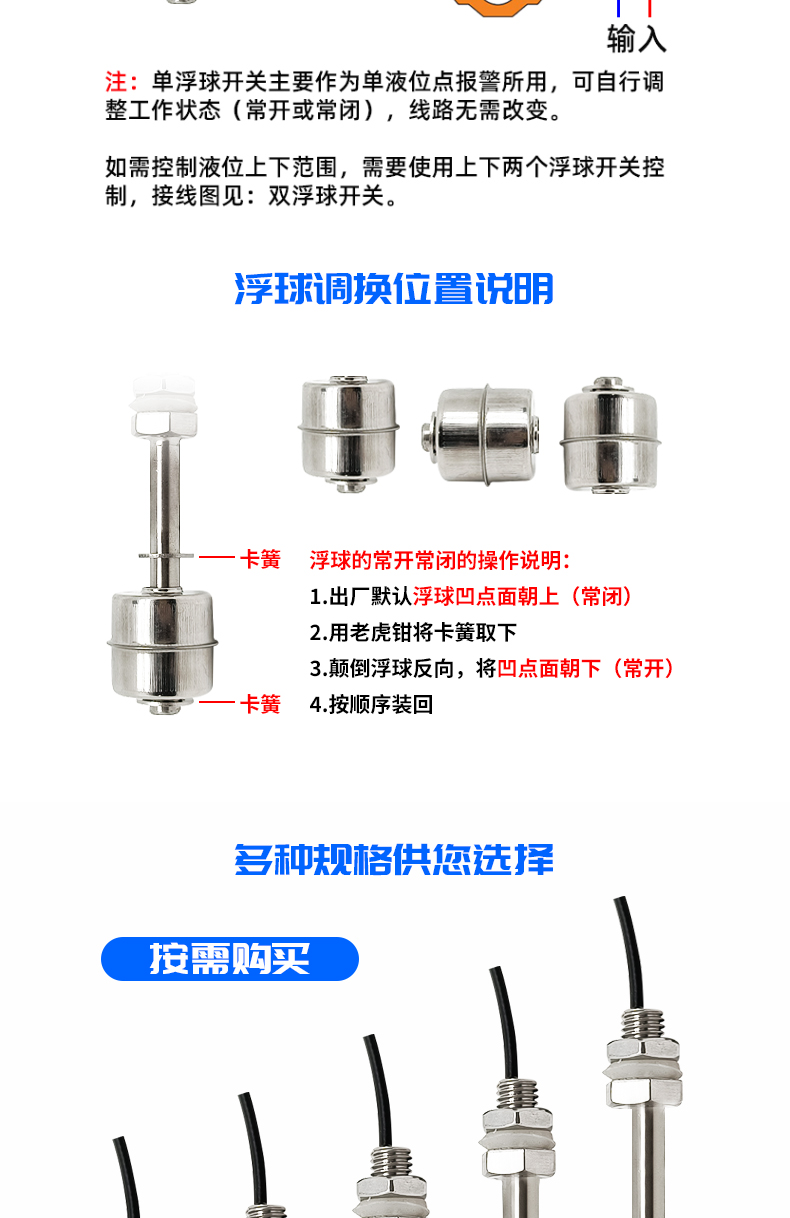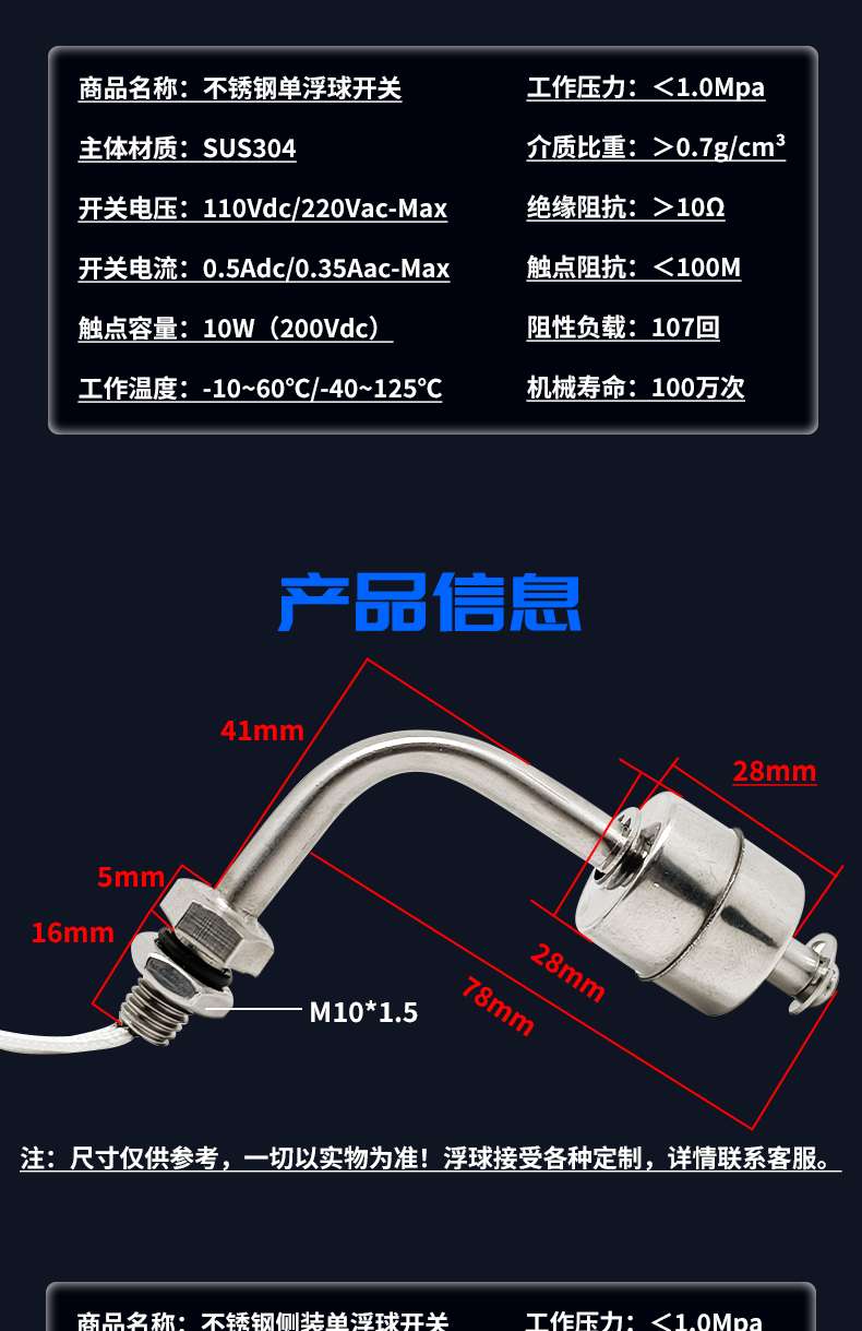 • 液位控制器水位控制器304高温不锈钢浮球开关 液位开关 水位开关