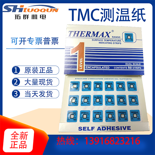 温度美牌THERMAX系列英国TMC热敏试纸采用温度测量的新工艺,不同于传统工艺是在一张小贴纸上布有一系列方格或圆点,来表示不同的温度,当测试点的温度大于该点的温度,颜色变为黑色或其他颜色。就可以判断物体所经历的温度。而不用长时间在旁监测。也可以用温度试纸做交货是的证据,这在食品和药品行业得到广范的应用。还有特殊行业用的测温纸,如纺织行业用热敏试纸。